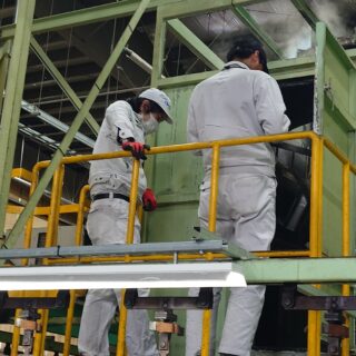 上の写真は製品が塗装ラインの中を無事に通過出来るかを心配そうに見ている社員達。